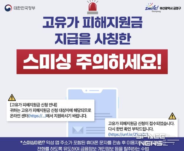스페이스뉴스 스페이스뉴스 기자 | 부산 금정구는 오는 4월 27일부터 ‘고유가 피해지원금’ 지급이 시작됨에 따라 이를 사칭한 스미싱(문자 결제 사기) 피해 예방을 위해 구민들에게 각별한 주의를 당부한다고 23일 밝혔다.