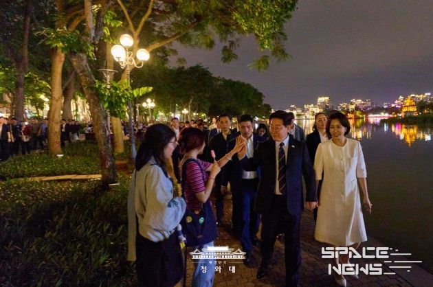 이어 이 대통령 부부는 인근 식당으로 자리를 옮겨 쌀국수와 볶음밥으로 저녁 식사를 함께했다. 이후 호안끼엠 호수 일대를 산책하며 베트남에서의 소중한 추억을 쌓았으며, 산책을 마친 뒤에는 베트남 국민들에게 다시 한번 손을 흔들어 인사를 전하며 일정을 마무리했다.