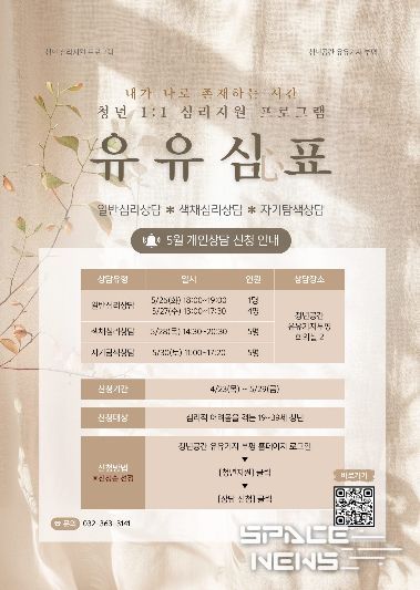 스페이스뉴스 스페이스뉴스 기자 | 부평구 청년공간 유유기지 부평은 청년 심리지원 프로그램 ‘유유심(心)표’ 5월 참여자를 모집한다.