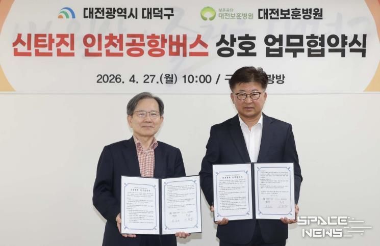 스페이스뉴스 스페이스뉴스 기자 | 대전 대덕구는 27일 신탄진-인천공항 간 공항버스 이용 활성화를 위해 대전보훈병원과 업무협약MOU)을 체결했다.