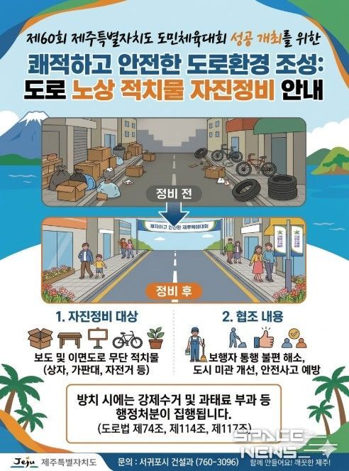 스페이스뉴스 스페이스뉴스 기자 | 서귀포시는 2026년 개최되는 4개 주요 체전에 대비하여 방문객과 시민들에게 안전하고 쾌적한 도로 환경을 제공하기 위해 ‘노상적치물 집중 정비’를 본격 추진한다고 밝혔다.