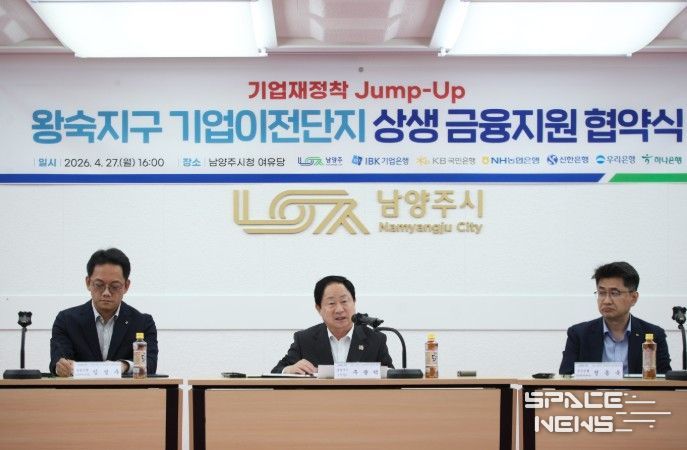 스페이스뉴스 스페이스뉴스 기자 | 남양주시는 27일 왕숙신도시 개발로 이전이 필요한 기업의 안정적 재정착을 지원하기 위해 ‘왕숙신도시 기업재정착 점프업(Jump-up) 상생금융’ 업무협약을 체결했다고 밝혔다.