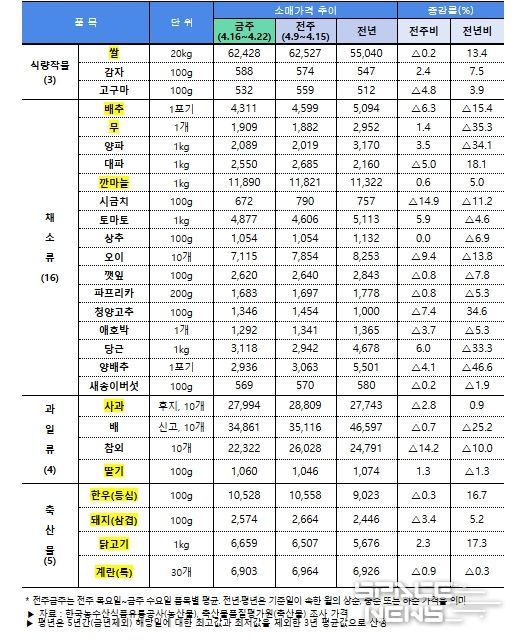 스페이스뉴스 스페이스뉴스 기자 | 농림축산식품부는 4월 5주 수급동향 점검 결과, 지난주와 특별한 변동 없이 농산물 가격은 전반적으로 전년 대비 낮은 수준을 유지하고 있는 것으로 나타났다고 밝혔다.