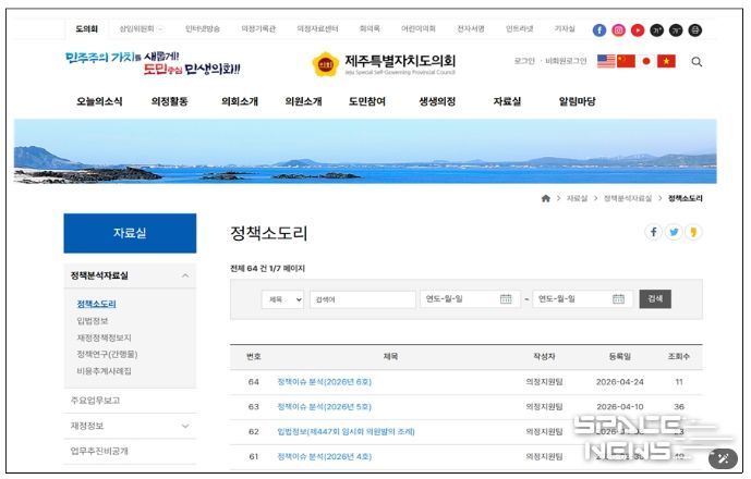 스페이스뉴스 스페이스뉴스 기자 | 제주특별자치도의회는 입법 및 정책 동향 등 주요 현안에 대한 최신 정보를 도민에게 신속히 제공하기 위하여 '정책 소도리'를 운영하고 있다고 밝혔다.