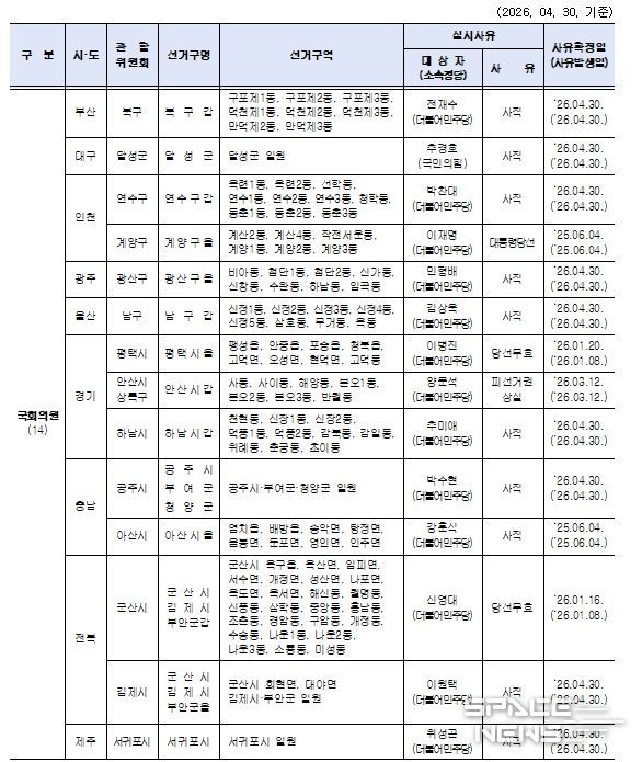 스페이스뉴스 스페이스뉴스 기자 | 중앙선거관리위원회는 6월 3일 제9회 전국동시지방선거와 동시 실시하는 국회의원 재·보궐선거의 선거구가 14곳으로 다음과 같이 확정됐다고 밝혔다.