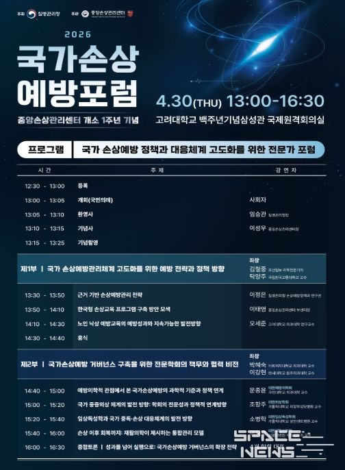스페이스뉴스 스페이스뉴스 기자 | 질병관리청은 중앙손상관리센터 개소 1주년을 맞아 4월 30일 고려대학교 백주년기념삼성관에서 「2026년 국가손상예방포럼」을 개최한다.