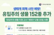 스페이스뉴스 스페이스뉴스 기자 | 생태계 피해 사전 예방! 유입주의 생물 152종 추가 - '유입주의 생물 지정 고시' 개정안 12월 30일 시행 ■ 지정대상 - 1,005종 (152종 추가) · 신규 지정 종: 어류(5종), 곤충(47종), 식물(100종) ■ 신규로 지정된 152종 수입하려는 경우 - 사전 관할 유역(지방)환경청 승인 필요 ※ 불법 수입 시 2년 이하 징역 또는 2천만원 이하 벌금 부과 ■ 확인방법 - 기후에너지환경부 누리집 및 한국외래생물정보시스템(2026년 1월 공개) 생태계 보전을 위해 유입주의 생물 수입에 각별한 주의를 기울여 주세요! [뉴스출처 : 기후에너지환경부]
