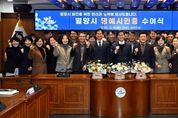 스페이스뉴스 스페이스뉴스 기자 | 경남 밀양시는 15일 시청 소회의실에서 밀양시 발전에 기여한 전·현직 부시장 3명에게 명예시민증을 수여했다. 밀양시 명예시민증은 우방국가 또는 다른 지방자치단체의 주민으로서 밀양시정에 공로가 현저하거나 밀양시를 방문하는 귀빈에게 수여하는 증서로, 밀양시 부시장을 역임한 27대, 28대, 29대 부시장에게 수여됐다. 수여 대상자는 △27대 밀양시 부시장 김성규(현 경상남도 교육청년국장) △28대 밀양시 부시장 허동식(현 부산진해경제자유구역청 개발본부장) △29대 밀양시 부시장 곽근석(현 밀양시 부시장)이다. 수여 대상자들은 재임 기간 동안 시정의 주요 현안을 해결하며 밀양시의 다양한 정책을 이끌어 지역의 경제적, 사회적 발전에 기여해 왔다. 특히, 나노융합국가산업단지 조성 및 기업유치 기반 강화, 창녕~밀양 간 고속도로 개통, 김해~밀양 고속도로 건설 추진 등 지역경제 활력을 위한 기반 마련에 공통적으로 힘써왔다. 아울러 스마트 선도 농업을 통한 활기찬 밀양 조성, 머물고 싶고 다시 찾는 밀양을 만들기 위한 다양한 정책을 추진하며 품격 있는 문화·관광 도