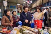 스페이스뉴스 스페이스뉴스 기자 | 이재명 대통령과 김혜경 여사는 오늘 낮, 설 명절을 앞두고 충북 충주시에 위치한 무학시장을 찾아 지역 세밑 물가를 점검하고 상인들을 만나 현장 의견을 청취했다. 무학시장은 지난 1978년 노점상들의 정착을 위해 개설된 전통시장이며, 이번 방문은 설 민심을 청취하기 위한 민생 행보의 일환이다. 이 대통령과 김 여사는 시장 내 여러 상점을 들러 “새해 복 많이 받으세요”라며 인사를 했고, 상인과 시민들은 환호와 박수로 이 대통령 부부를 맞았다. 이 대통령 부부에게 더덕을 판매한 상인은 “덕분에 마수걸이를 한다”며 “오늘 장사가 잘될 것 같다”고 말해 웃음을 자아냈다. 다른 상인들도 “힘나게 해주셔서 감사하다”, “너무 고생 많으시다”며 인사를 전했다. 이 대통령 부부는 황태포, 시금치, 곶감과 깐밤 등 제수용품과 먹거리를 구입했고 백도라지, 마른 멸치, 배추전 등을 즉석에서 맛보기도 했다. 이 대통령 부부는 온누리상품권과 현금으로 결제했다. 김 여사가 물건을 고르는 사이 이 대통령은 상인들에게 “장사는 잘 되느냐”, “곧 설인데 어떠시냐”고 물었다. 정육점