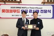 스페이스뉴스 스페이스뉴스 기자 | 부산 남구는 지난 11월 11일, 롯데웰푸드(주)에 감사패를 수여했다고 밝혔다. 롯데웰푸드(주)는 2020년 9월, 빼빼로데이와 연계해 남구·부산지방보훈청·롯데제과㈜ 간 '턴 투워드 부산(Turn Toward Busan)' 업무협약을 체결한 이후, 매년 ‘턴 투워드 부산’ 엠블럼이 새겨진 기획 상품을 제작해 평화의 메시지를 전해왔다. 또한 해외 및 국내 참전용사에게 감사 편지를 담은 선물 패키지를 제작해 감사한 마음을 전달하며 기업의 사회적 책임을 실천하고 있다. 오은택 남구청장은 “그동안 ‘턴 투워드 부산(Turn Toward Busan)’과 유엔평화문화특구 가치 확산을 위해 함께해 준 롯데웰푸드에 감사드린다”며 “앞으로도 다양한 기관과 협력하여 평화의 의미를 이어가고 주민들이 공감할 수 있는 남구를 만들어가겠다”고 전했다. [뉴스출처 : 부산시남구]