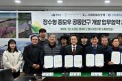 스페이스뉴스 스페이스뉴스 기자 | 장수군은 장수한우지방공사, 이티바이오텍(주), 전북대학교와 장수군청 회의실에서 장수한우 품질 고급화를 위한 ‘장수형 저탄소 종모우 개발’ 공동연구 상호협력 업무협약(MOU)을 체결했다고 11일 밝혔다. 이번 협약은 협약기관 간 상호 업무협조 체계를 구축해 장수 한우 산업의 경쟁력을 높이기 위한 장수 지역 사양환경에 적합한 우수 유전자원을 확보하고, 탄소배출을 줄이면서도 생산성과 품질을 높일 수 있는 종모우 개발을 위해 마련됐다. 특히 종모우 개발을 통해 장수 한우 고유의 유전형질을 확립하고 탄소배출 저감과 생산성 향상을 동시에 달성하는 것이 핵심 목표다. 협약에 따라 군은 저탄소 종모우 개발을 위한 사업 총괄 및 행·재정적 지원을 하고 장수한우지방공사는 채정·가공·사양관리와 농가 컨설팅에 나선다. 또한 이티바이오텍은 유전체 기반 연구개발을 진행하고 전북대학교는 유전 능력 평가와 우량 암소·후보 종모우 선발을 각각 담당한다. 장수군은 이번 공동연구를 최근 지정된 전북특별자치도 농생명산업지구 내 ‘저탄소한우 산업지구’ 조성사업과 연계해 2030년까지 단계적