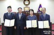스페이스뉴스 스페이스뉴스 기자 | 영종구 출범 원년을 맞아 올해 새롭게 개관한 ‘영종하늘누리센터’의 안정적·체계적 운영을 위해 인천시 중구가 인천시 교육청, 운서중학교와 손을 맞잡았다. 김정헌 인천 중구청장과 도성훈 인천시 교육감, 김성오 운서중학교장은 10일 오후 영종하늘누리센터 하늘배움터에서 이러한 내용의 ‘인천운서중 학교복합시설(영종하늘누리센터)의 운영과 관리에 관한 업무 실시협약’에 서명했다. ‘영종하늘누리센터’는 인천 중구가 운서중학교 부지 내 일부를 무상으로 제공받아 하늘초롱길 69 일원에 지하 1층, 지상 4층 연면적 5,635㎡ 규모로 건립한 ‘학교복합시설’이다. 지난 2024년 6월 첫 삽을 떠 올해 1월 건립 공사를 모두 마쳤으며, 3월 준공식을 개최한 후 현재는 운영 본격화에 행정력을 집중하고 있다. 특히 다함께돌봄센터 7호점(거점형), 육아종합지원센터, 가족센터, 영종하늘누리 작은도서관이 지난 2월부터 입주해 다양한 복지·문화 서비스를 구민들에게 제공하고 있다. 이번 협약은 지난 2021년 영종하늘누리센터 건립을 위해 체결한 기본 업무협약의 내용을 한층 더 구체화
