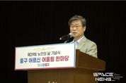 스페이스뉴스 스페이스뉴스 기자 | 서울 중구가 제29회 노인의 날(10월 2일)을 기념해 지난 2일 중구 구민회관 대강당에서 기념식과 함께 어르신 어울림 한마당을 열었다. 이날 행사에는 어르신과 내빈 등 500여 명이 참석해 어르신들에 대한 노고에 존경과 감사를 표했다. 1부에서는 노인 복지와 지역 발전을 위해 헌신하신 65세 이상 모범어르신 3명과 노인복지 기여자 9명, 기여 단체 1곳에 표창이 수여됐다. 2부 행사에서는 초대가수 축하공연과 어르신 장기자랑이 펼쳐졌다. 어르신으로 구성된 11팀이 무대에 올라 노래와 악기 연주 실력을 뽐내며 흥겨운 시간을 만들었다. 김 구청장도 '고맙소'라는 노래를 불러 어르신들의 호응을 얻었다. 행사장 로비에는 영양 건강 체험 부스가 마련되어 어르신들이 드신 식사의 칼로리와 나트륨양 등을 직접 계산해보고 균형잡힌 식사법에 대한 상담도 받을수 있었으며, 추척사진관 부스에서는 교복을 입고 사진을 찍으며 옛 추억을 떠올렸다. 행사에는 한국삭도공업주식회사, 대신자산신탁, 한마음라이온스, 중구자원봉사센터를 비롯한 여러 업체와 기관이 경품, 기념품, 간식 등을 후원해 더욱