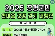 스페이스뉴스 스페이스뉴스 기자 | ‘2025 증평군민 한마음 건강걷기대행진’이 오는 27일 오전 7시, 증평 보강천 운동장에서 열린다. 증평군체육회(회장 최재옥)가 주관하는 이번 행사는 군민의 건강 증진과 화합 도모, 가족 중심의 여가 문화 확산을 위해 마련됐다. 걷기 코스는 보강천 운동장을 출발해 천변공원, 김득신 다리, 무궁화길을 거치는 약 3.5km 구간이다. 경사가 완만하고 자연경관이 뛰어나 남녀노소 누구나 부담 없이 참여할 수 있는 코스로 구성됐다. 사전 신청 없이 군민 누구나 자유롭게 참여할 수 있으며, 참가자 전원에게 기념품이 제공되고 다양한 경품 추첨도 함께 마련된다. 체육회는 이번 걷기 대행진을 통해 군민이 함께 어우러지는 건강한 공동체 분위기를 조성하고, 삶의 질 향상에도 기여할 것으로 기대하고 있다. 최재옥 회장은 “보강천변의 아름다운 경관을 따라 가족, 친구들과 함께 걸으며 건강도 챙기고 즐거운 추억도 만드는 시간이 되길 바란다”며 “많은 군민들의 참여를 부탁드린다”고 말했다. [뉴스출처 : 충청북도증평군]