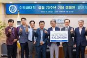 스페이스뉴스 스페이스뉴스 기자 | 진주 동명고등학교를 졸업한 수의사들로 구성된 ‘동수회’(회장 김도경 동명대학교 반려동물대학 학장)가 경상국립대학교 수의과대학 설립 70주년 기념행사 후원을 위해 발전기금을 출연했다. 발전기금 전달식은 9월 19일 오후 3시 대학본부 3층 접견실에서 열렸다. 이번에 전달한 발전기금은 동수회 소속 회원들이 뜻을 모아 마련한 2000만 원으로, 수의과대학 설립 70주년 기념사업의 원활한 진행과 후학 양성을 위한 행사 지원에 사용될 예정이다. 이로써 현재까지 수의과대학 설립 70주년 기념행사 후원금은 총 6120만 원에 달한다. ‘동수회’는 진주 동명고등학교를 졸업한 수의사 약 70명으로 구성된 단체로, 2000년 결성 이후 현재까지 활발한 교류와 친목을 이어오며 수의학 발전과 고향 후배들을 위해 꾸준히 뜻을 모아 왔다. 이번 발전기금 출연은 “경상국립대학교 수의과대학의 역사와 전통을 축하하고, 고향의 대학과 후배들의 발전에 작은 보탬이 되고 싶다.”라는 회원들의 뜻을 반영한 것이다. 이날 행사에는 권진회 총장을 비롯해 이성갑 교학부총장, 김봉조 기획처장, 김경수 국제협력부처장, 수의